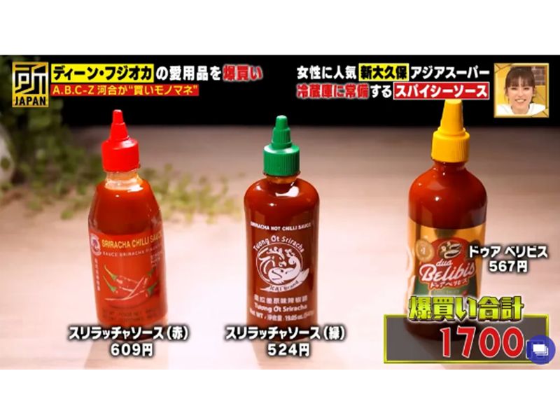 また、少し前の話になりますが、1/11に放映されたフジテレビの「所JAPAN」で、当社のチリソース「ドゥアブリビス」が紹介されています。当日のゲストである、俳優のディーン・フジオカ氏の細君はインドネシア人で、ご夫婦のお気に入りのチリソースとして話題に上ったものです。ドゥアブリビスチリソースは、ガルーダインドネシア航空の機内食や、ケンタッキーなどでも採用されている人気のチリソースです。二宮では日本正規代理店として、長年に渡り、輸入しております。