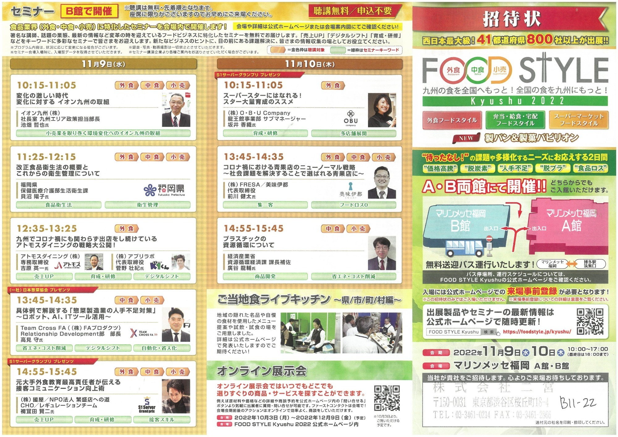 11月9日から10日の二日間、福岡県福岡市博多にある、マリンメッセ福岡において、「Food Style 九州」が開かれるにあたり、二宮も出展します。