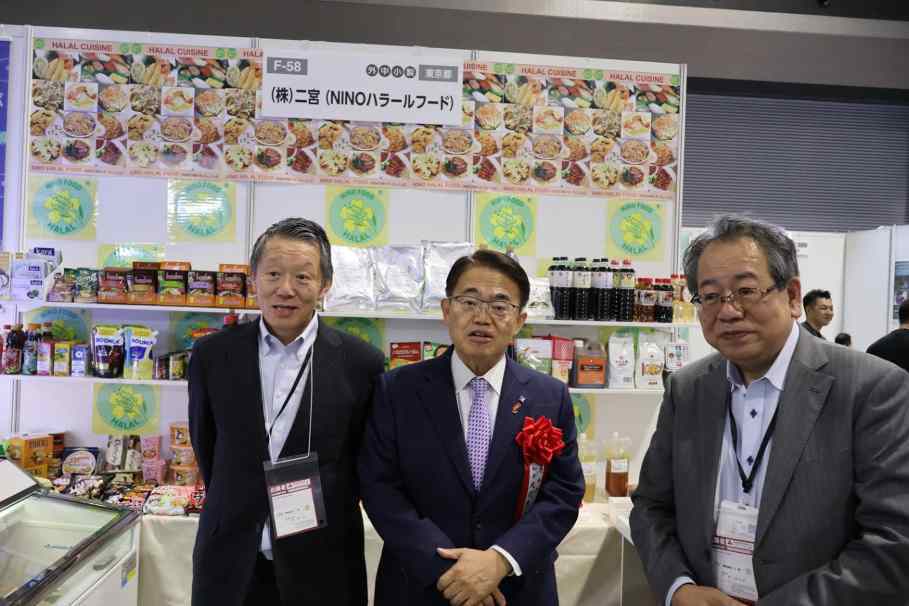 大村愛知県知事はセレモニーの後、場内の視察を行いましたが、その途中で二宮ブースにも立ち寄り、人気のハラール冷凍たこ焼きを頬張りました。その上で、「とても美味しい。来年の『第20回 愛知・名古屋 アジア競技大会』開催を控え、愛知県としてもムスリムへの対応は真剣に取り組みたいと考えています。名古屋は発酵・醸造文化を誇り、世界へもアピールしたい。ただ一方で、発酵・醸造食品にはアルコールをはじめ、イスラームの戒律に触れるものも多く、ハラール調味料で代替できる場合もあるので、食の多様性を見据え、ハラール対応にも力を入れたい」と述べました。