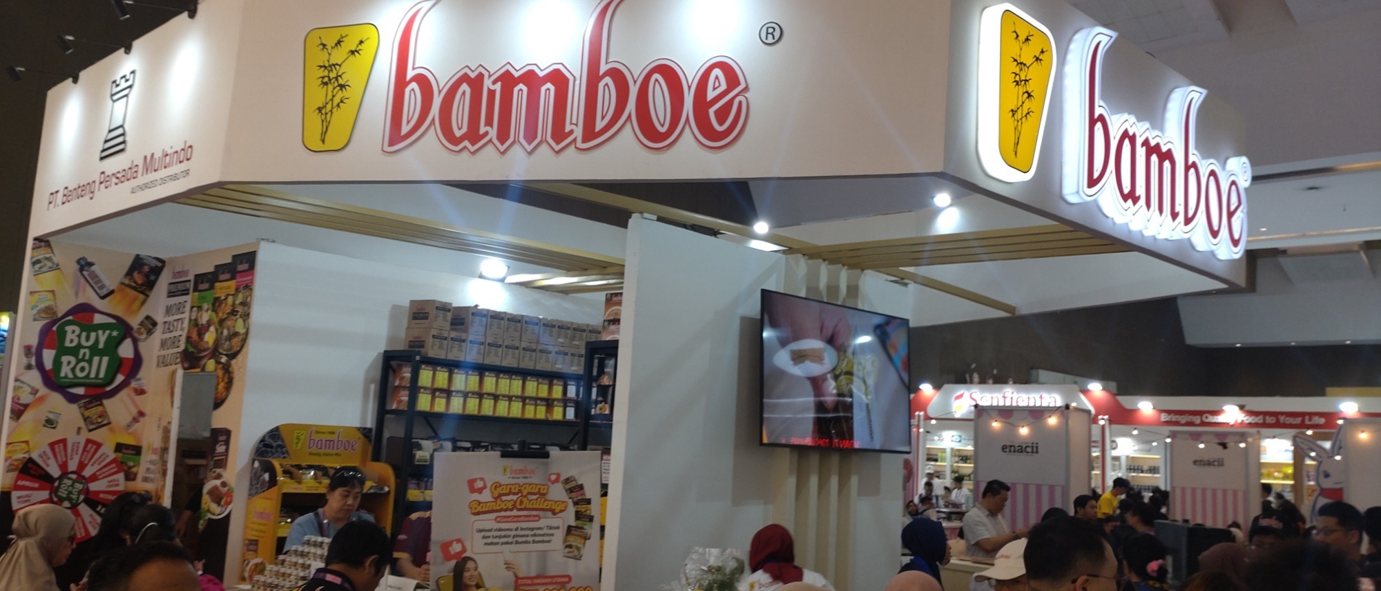 二宮は、会場入り口付近に出店を構え、インスタントラーメン、ハラール調味料、スナックなど、いずれもインドネシア製品を所狭しと並べ、来場者を迎え入れていました。