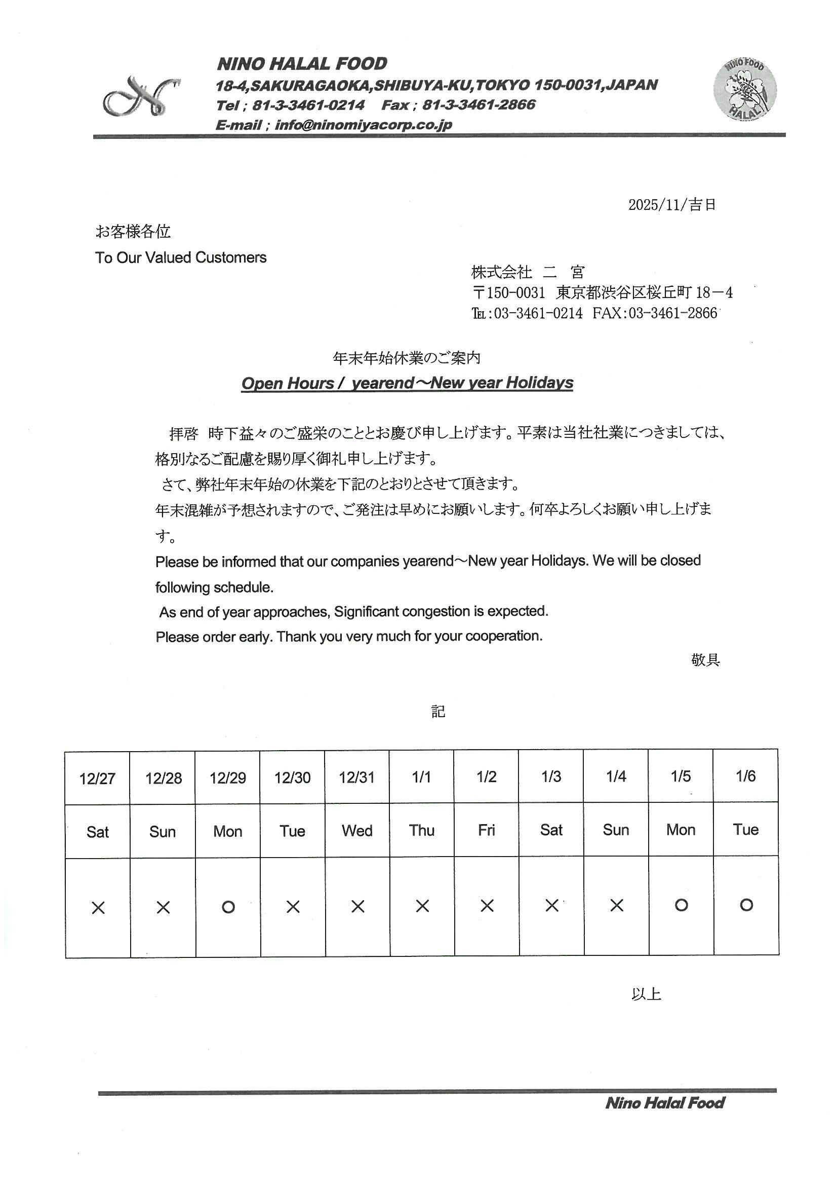 二宮は、12月30日(火)から来年1月4日(日)までの間、年末年始のお休みを頂きます。