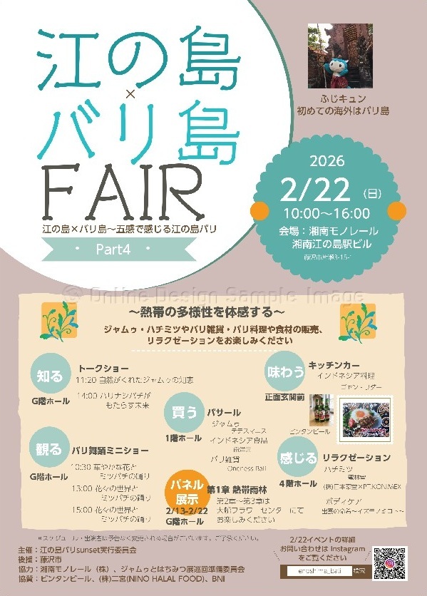 来る2月22日、湘南モノレール・湘南江の島駅ビルにおいて、「江ノ島×バリ島Fair Part4 熱帯の多様性を体感」が開催されるにあたり、二宮が協賛社として参加します。