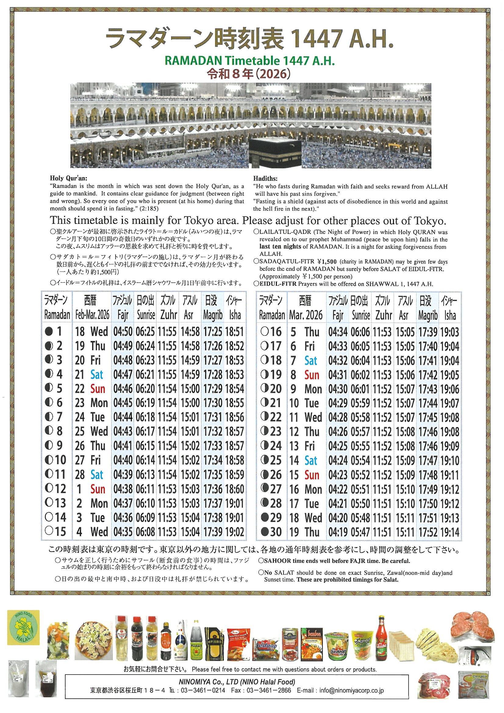 二宮では例年通り、ラマダーンタイムテーブルを配布しております。ご希望の方は、下記までお問い合わせください。